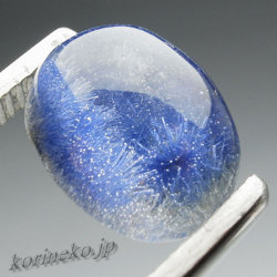 結晶の形も不鮮明で、なんとなく青い水晶、青い内包物のある、あまり美しく無い水晶という印象だったのだが、最近みかけるものは、抜けるような美しい青が、透明な水晶に内包されているというもの。